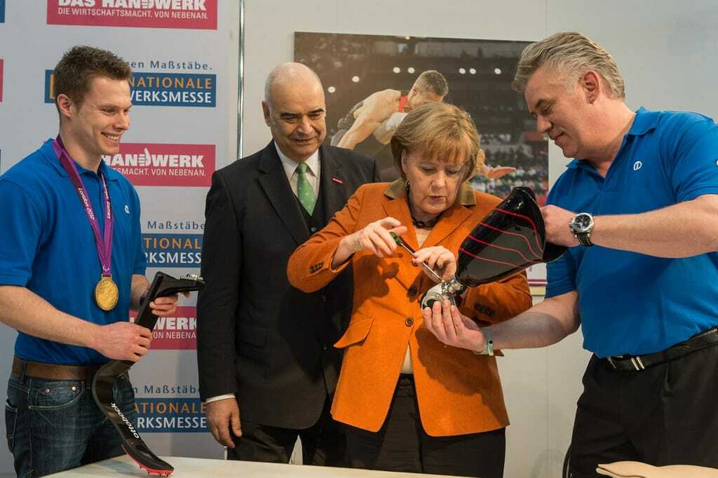 März: Auf der Internationalen Handwerksmesse in München präsentieren mehr als 1.000 Aussteller Neuheiten aus dem Handwerk. Das Motto: Zukunft kommt von Können. Rund 138.000 Besucher kommen auf die Messe München –unter ihnen auch Bundeskanzlerin Angela Merkel. Die Regierungschefin baut mit Paralympics-Star Markus Rehm eine Prothese zusammen.