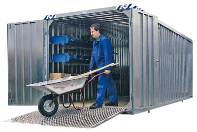 Die Schnellbaucontainer werden durch Erweiterungsmodule zur kleinen Lagerhalle. Diese „Container-Kombinationen“ bieten unterschiedliche Grundflächen, können jederzeit einfach an einen anderen Standort verändert werden und sind eine preisgünstige Lösung. Zu erhalten sind sie mit oder ohne Boden in Größen von 3 u 4 m bis 5 u 6 m und einer Höhe von 2,1 m.