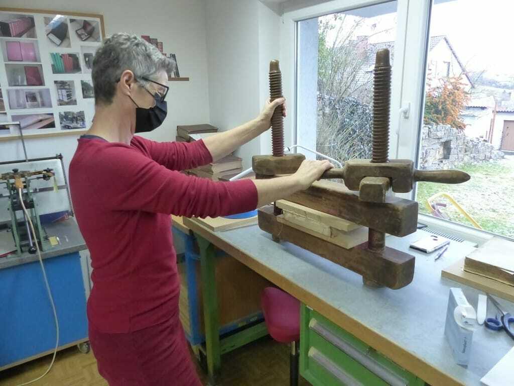 Ihre Begeisterung für das Buchbinden entdeckte sie vor mittlerweile 26 Jahren. Seitdem hat sich in der Branche viel verändert. Medientechnologen, die Digitalisierung und das E-Book ließen das Handwerk auf rund 500 Buchbindereien in Deutschland schrumpfen. Für die Übriggebliebenen heißt das: Je weniger Kollegen, desto mehr Arbeit. Denn einige Bibliophile, meist aus der älteren belesenen Generation der Region, bleiben dem traditionellen Handwerk weiterhin treu. "Der Buchbinder in Würzburg hört auf, also kommen die Kunden mit ihren Aufträgen zu mir", schildert Stahl. Als die Pandemie im vorigen Jahr ausbrach, stand auch in ihrer Werkstatt erstmal alles still. Doch dann trafen mehr Aufträge als sonst ein. "Per Post natürlich. Ich komme kaum noch hinterher. Da kann ein Auftrag schonmal etwas Zeit in Anspruch nehmen", sagt sie und lässt ihren Blick über die Bücherstapel schweifen.