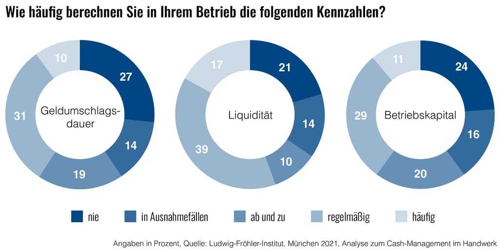 Wie weit kann ich beim Angebot der Konkurrenz mitgehen? Welchen Preis muss ich verlangen, um die gestiegenen Materialkosten zu decken? Wie hoch ist die Auftragsquote? Und wie steht es mit dem Liquiditätsgrad? Die sorgfältige Analyse von Kennzahlen ist ein wichtiger Bestandteil der Unternehmensplanung, da sie Einblicke in die Finanzlage, die Leistung und die Effektivität des Unternehmens gibt. Doch nicht alle Chefs wollen sich mit ihren Zahlen auch tatsächlich beschäftigen, wie eine Umfrage des Ludwig-Fröhler-Instituts in München unter bayerischen Handwerksunternehmen zeigt. So ermittelt rund ein Drittel der Unternehmerinnen und Unternehmer nie oder nur in Ausnahmefällen die verfügbare Liquidität. Gleiches gilt für rund 40 Prozent beim Betriebskapital und der Geldumschlagsdauer. Dabei haben mit Zahlen geführte Betriebe unabhängig von ihrer Mitarbeiterzahl laut Studienergebnissen weniger Liquiditätsprobleme sowie eine höhere Gesamtkapitalrentabilität und kommen zudem leichter an Fremdkapital.