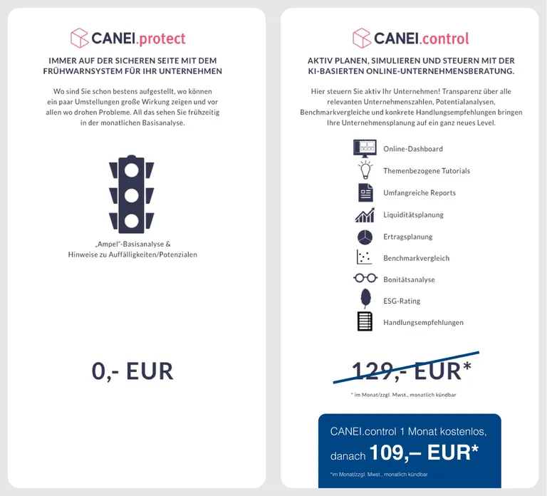 Fangen Sie mit einem kleinen Modell an und erhalten Sie mit dem dauerhaft kostenlosen "CANEI.protect" einen neuen, einfachen Blick auf Ihre betrieblichen Kennzahlen. Das Tool bietet Ihnen Kontrolle und Sicherheit in der Unternehmensführung. Sie erkennen frühzeitig Risiken, bekommen wertvolle Handlungsempfehlungen und sehen jederzeit, wie Ihr Unternehmen im Branchenvergleich dasteht. Wenn Sie tiefer in die aktive Planung einsteigen möchten, können Sie ganz einfach auf "CANEI.control" upgraden. Über die Kooperation mit SIGNAL IDUNA können Sie die erweiterte Softwareversion exklusiv einen Monat kostenlos testen. Im Anschluss erhalten Sie einen attraktiven Sonderrabatt und zahlen monatlich nur 109 Euro statt 129 Euro.