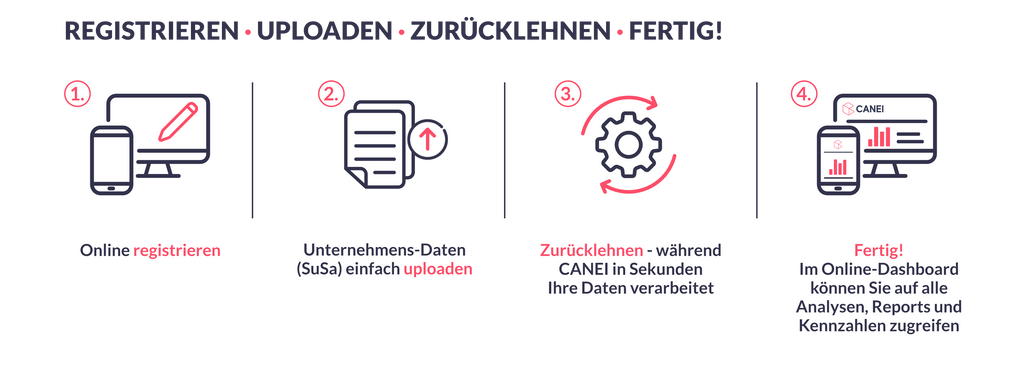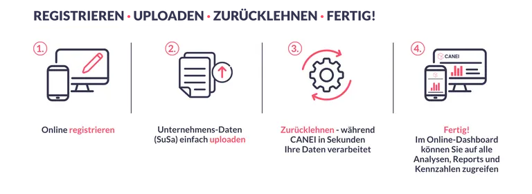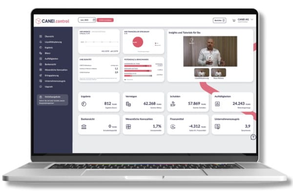 CANEI bietet Ihnen eine optimale Entscheidungshilfe bei allen typischen Unternehmerfragen: Das Tool zur Kennzahlenanalyse arbeitet mit Hilfe künstlicher Intelligenz, erkennt frühzeitig Risiken und gibt wertvolle Handlungsempfehlungen – ganz einfach per Upload der Summen- und Saldenliste. Entdecken Sie jetzt das Tool und profitieren Sie von attraktiven Sonderkonditionen.