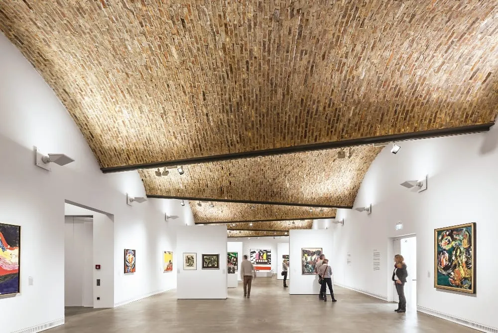 Die Heizmethode kommt den Anforderungen eines Kunstmuseums in besonderer Weise entgegen. Denn die ausge stellten Werke bedürfen einer konstanten Raumtemperatur von 20 °C. Ähnliches gilt für die Luftfeuchtigkeit, die bei 50 Prozent liegen sollte, mit einem geringen Toleranzbereich von je fünf Prozent nach oben oder unten. Die Lüftungsanlage mit Wärme- und Feuchtigkeitsrückgewinnung wurde als Quelllüftung realisiert, bei der Frischluft an den Sockellei sten der Böden eingeblasen und die verbrauchte Luft an den Decken wieder abgesaugt wird.