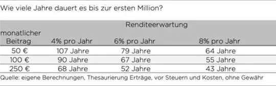 Bei der konkreten Umsetzung lauern jedoch einige Fallstricke. Zum einen ist die Anlageklasse entscheidend. Die erforderliche Nettorendite, um die Million zu erreichen, ist nur mit Aktien zu erzielen. Die langjährige Durchschnittsperformance in einem breit gestreuten Aktienfonds oder ETF liegt bei rund sieben bis acht Prozent pro Jahr. Im Vergleich dazu erwirtschaften zehnjährige Bundesanleihen derzeit nur einen Zins von rund 2,5 Prozent pro Jahr.