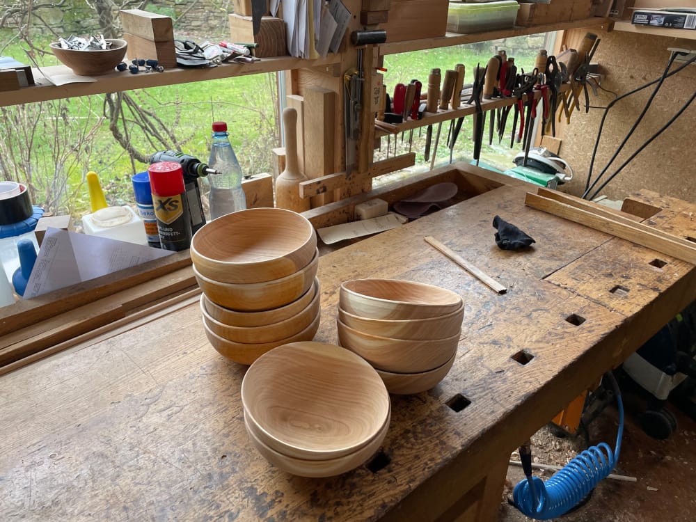 Nachdem er Hakeneisen aus England bestellte und feststellte, dass diese nicht seinen Vorstellungen entsprachen, ging er zum örtlichen Schmied, um sich die Werkzeuge nach seinen Vorstellungen machen zu lassen. Aber: "Das war auch nicht so das Wahre. Aber damit konnte ich dann schon ein bisschen was machen." Immer noch dreht sich das Holz, aus dem hier eine Schüssel entstehen soll, vor und zurück. Schnell gleitet das Messer, über die Oberfläche und schneidet längliche Späne ab. "So richtig der Durchbruch kam, als ich mir meine eigene kleine Schmiedeesse gebaut habe. Und da bin ich dann eigentlich so richtig eingestiegen, weil dann konnte ich meine eigenen Werkzeuge herstellen und das ist das A und O."
