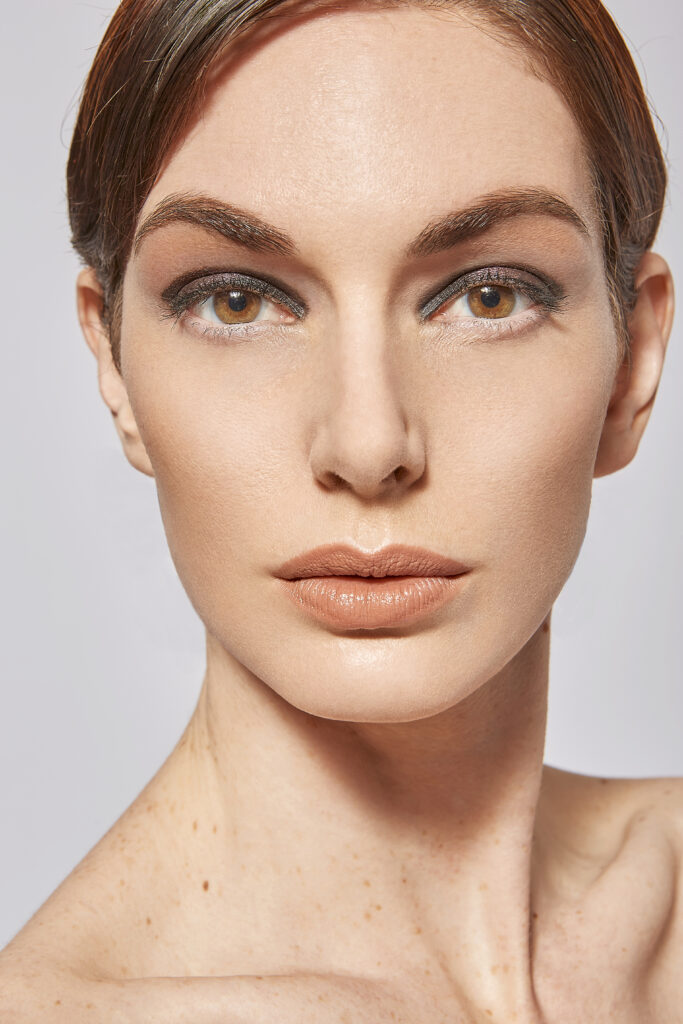Mit hart endender Kante wird am oberen Wimpernkranz ein kräftiger Eyeliner mit schwarzem Kajal gezogen. Mit dem gleichen Kajal wird für dieses Abend-Make-up das bewegliche Lid ausgemalt. Anschließend wird die Fläche mit schwarzem Lidschatten fixiert und in der Mitte ein Spotlight in glänzendem Bordeaux aufgetragen. Für einen noch eindrucksvolleren Effekt wird lediglich der obere Wimpernkranz schwarz getuscht. Die Augenbrauen werden mit einem dunklen Augenbrauenpuder aufgefüllt und nach oben gebürstet. Vervollständigt wir das Make-up durch eine Konturierung mit dezentem, dunklerem Puder und Lippen im matten Nude.