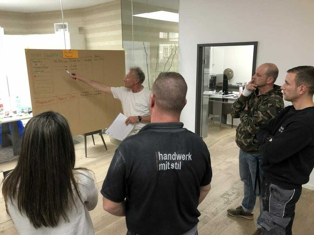 Der Stuttgarter Handwerksbetrieb erprobte die Methode Shopfloor-Management, welche Besprechungen effizient organisieren und damit die Zusammenarbeit zwischen Mitarbeitern und Führungskräften hierarchieübergreifend verbessern soll. Gemeinsam mit Kammer-Personalberaterin Nicola Pauls und Prof. Dr. Maximilian Wolf, einem Experten für Shopfloor-Management im Handwerk, hat Geschäftsführer sowie Maler- und Lackierermeister Thomas Rodens die neue Arbeitsweise im Unternehmen etabliert, um die Kommunikations- und Informationskanäle unter den Mitarbeitern zu stärken.