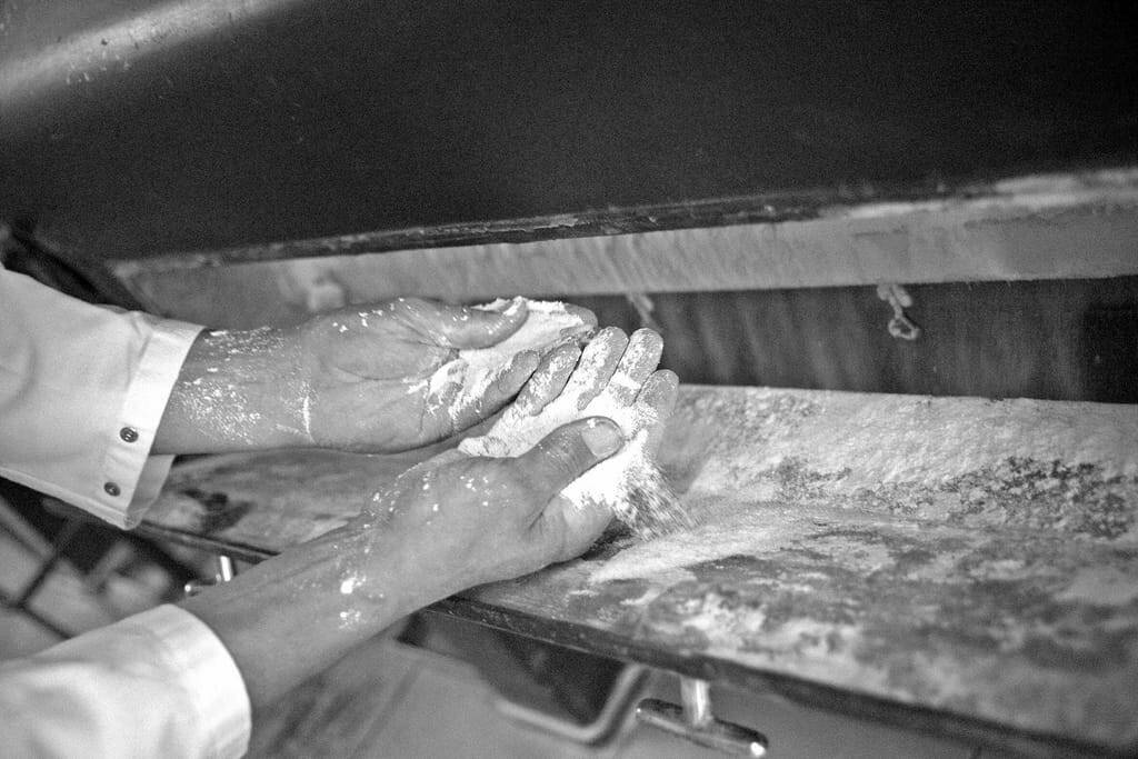 Wie die Herstellung funktioniert, kann man sich direkt in der historischen Mühle anschauen. Das Getreide wird früh am Morgen von den Bauern aus der Region angeliefert und landet zunächst im 15 Meter hohen Silo. Danach legt es einen langen Weg in der Mühle zurück: Vom Dachgeschoss fällt es in einem Rohr nach unten in die Mahlmaschinen, wird zwischen zwei Walzen zerkleinert und anschließend mit einem Förderaufzug nach oben in den dritten Stock transportiert. Hier stehen große, rechteckige Holzsiebe, die hin und her rütteln und die groben Getreideteile aussortieren. Diese fallen dann wieder durch Rohre nach unten. Das ganze wiederholt sich bis zu 16 Mal.