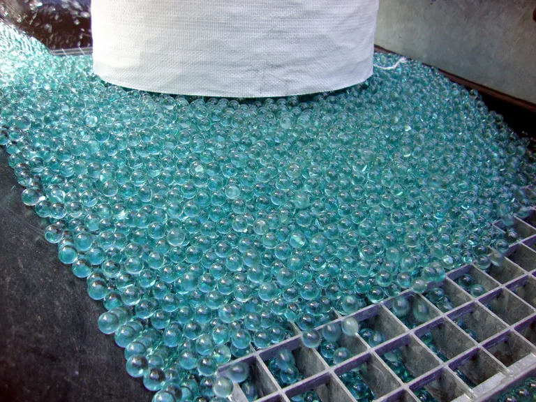 Hunderte kleine Glaskugeln rollen über den Schreibtisch von Frank Herrmann. Der Geschäftsführer der Firma Ochs Brunnenbau versucht sie für ein Foto wieder einzufangen. Gar nicht so einfach, wie sich herausstellt, denn die Kugeln haben einen Durchmesser von etwa einem Millimeter. Eine Handvoll davon fühlt sich an wie ein Haufen Sand. Während der Sand jedoch als Haufen auf dem Schreibtisch liegen bliebe, sind die Glaskugeln völlig glatt und rollen ganz hervorragend über die Schreibtischoberfläche weiter auf den Fußboden und in jede Ritze.