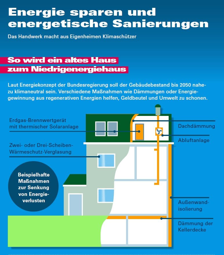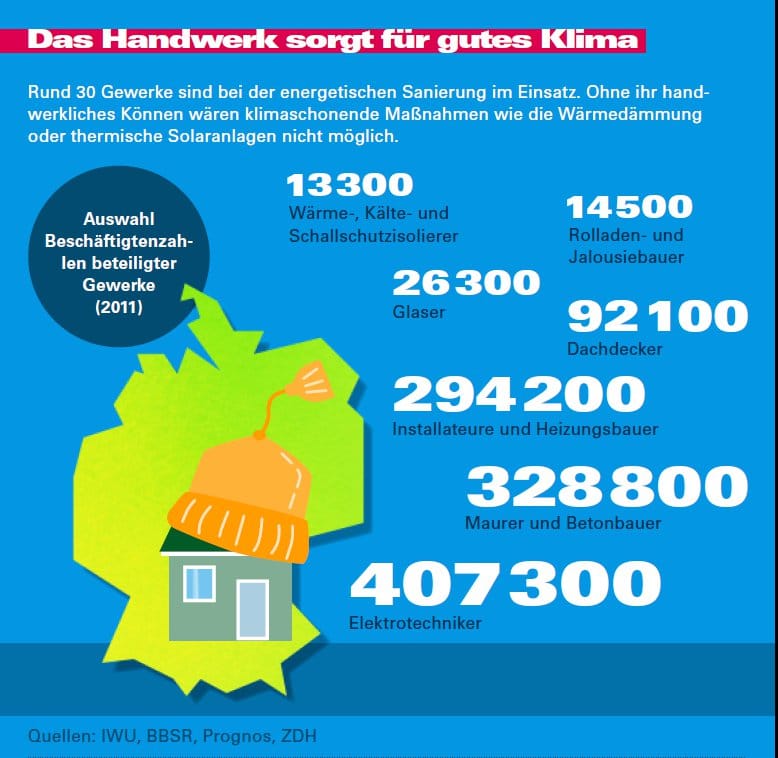 Das Handwerk macht Eigenheim-Besitzer zu Klimaschützern. Die energetische Sanierung von Gebäuden ist eine der wichtigsten Säulen für das Gelingen der Energiewende. Das macht die rund dreißig beteiligten handwerklichen Gewerke vom Anlagenmechaniker SHK bis zum Zimmerer unverzichtbar. Denn ohne klimaschonende Maßnahmen wie Wärmedämmungen oder Lüftungssysteme ist das kaum denkbar.