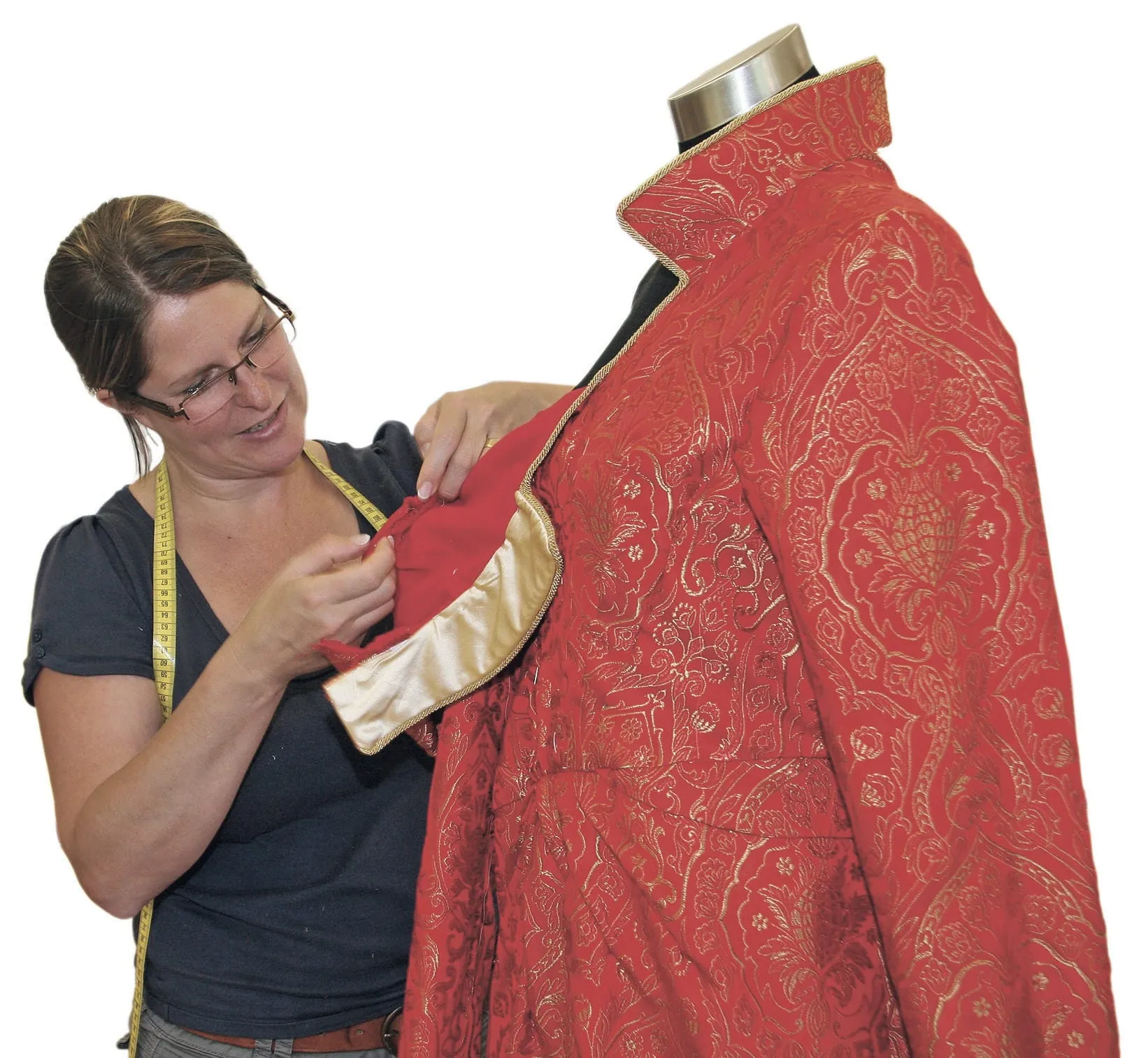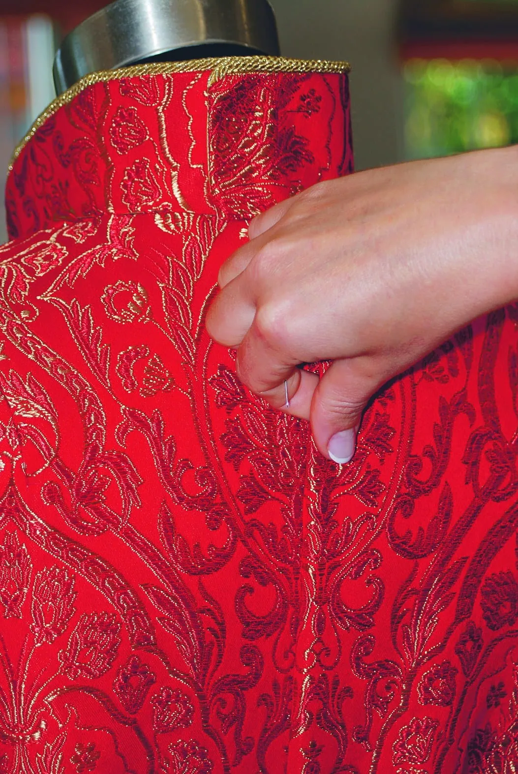 Die Zeit drängt, bis zum Fest sind es nur noch wenige Tage und Honold konnte erst spät mit den Arbeiten anfangen – der Auftrag kam verzögert, das Material musste erst noch bestellt werden: "Dieser Stoff hier ist eine Spezialanfertigung, es gibt nur noch wenige Webereien in Deutschland, die so etwas können", sagt Honold und zeigt das aufwändige Muster von Ananas, Granatapfel und Ornamenten in dem roten Gewebe. "150 Euro kostet ein Meter hiervon. Da nutzt man jeden Zentimeter."