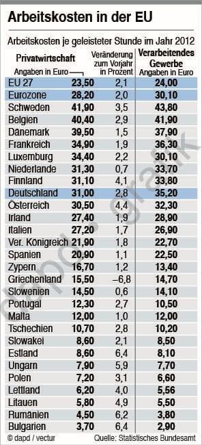Erstmals seit knapp zehn Jahren stiegen damit die Arbeitskosten in den Jahren 2011 und 2012 hierzulande wieder stärker als im EU-Durchschnitt. Während der 2012 bei plus 2 Prozent lag, erhöhten sich die Arbeitskosten in der Bundesrepublik im Vergleich zu 2011 um 2,8 Prozent.