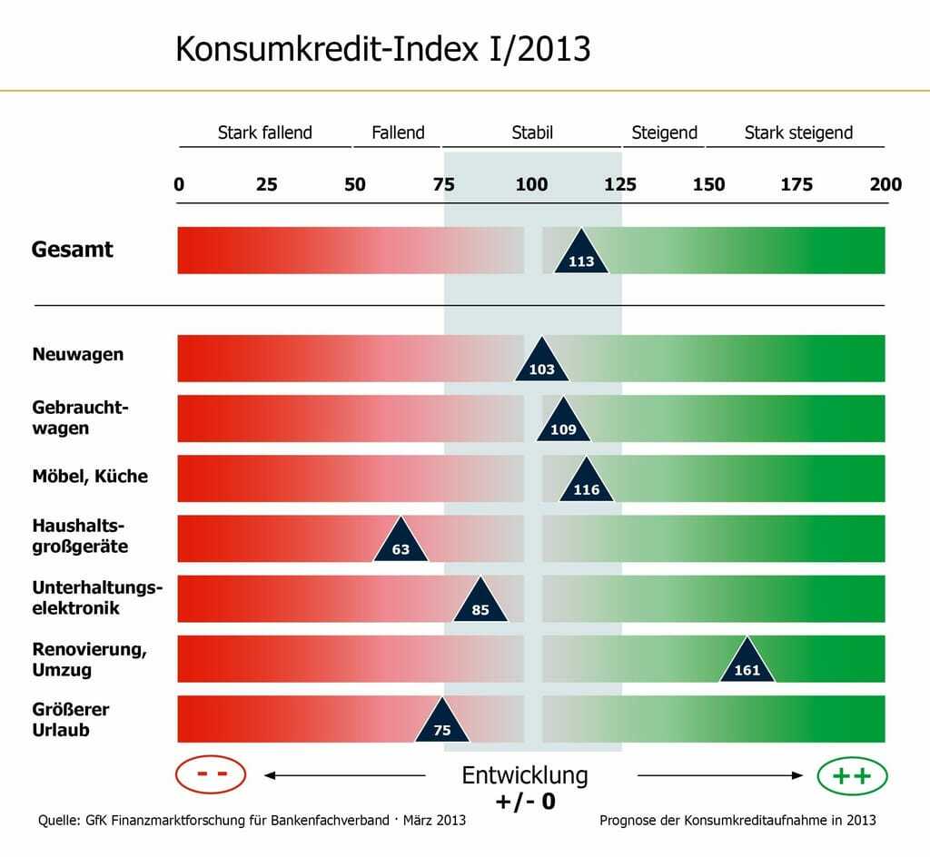 Auch für die meisten Gruppen von Konsumgütern, zum Beispiel Neu- und Gebrauchtwagen, ist die Prognose stabil. Zudem zeigt der Index, dass auch Finanzierungen für Möbel und Küchen sowie für Unterhaltungselektronik konstant bleiben. Ein Rückgang ist lediglich bei Krediten für Haushaltsgroßgeräte zu erwarten. Ende 2012 hatten Banken an Verbraucher bundesweit 224,6 Mrd. Euro zu Konsumzwecken verliehen.