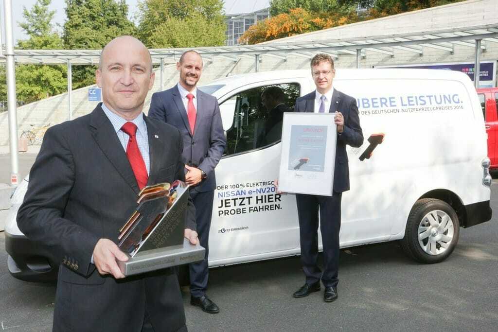 2016 gibt beim Deutschen Nutzfahrzeugpreis zum ersten Mal auch einen Sonderpreis in der Kategorie Elektro-Stadtlieferwagen. Gewonnen hat der Nissan E-NV200. Die Konkurrenten in dieser Kategorie waren der Renault Kangoound der Peugeot Partner. Thomas Hausch, Managing Director vom Nissan Center Europe, war hoch erfreut über die Auszeichnungund nannte es mutig von Holzmann Medien, solch einen Sonderpreis auszuloben. "Sie sollten diesen Preis auch künftig vergeben", sagte Hausch, denn Deutschland sei bei der Elektromobilität noch ein Entwicklungsland.