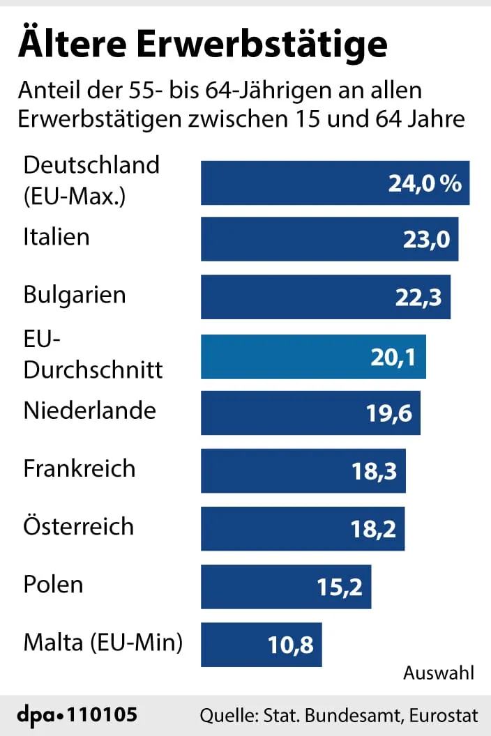 Deutschland hat die älteste Arbeitsbevölkerung in der Europäischen Union. In keinem anderen Land der Staatengemeinschaft sind anteilig mehr Erwerbstätige im Alter zwischen 55 und 64 Jahren, wie das Statistische Bundesamt auf der Grundlage von Eurostat-Daten mitteilte.