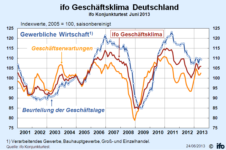Nichts scheint aktuell die gute Wirtschaftsstimmung der Deutschen trüben zu können. Weder Hochwasser noch Eurokrise trüben nach Ansicht der Konjunkturforscher die Stimmung. Im Gegenteil: Die deutsche Wirtschaft tankt zur Jahresmitte weiter Zuversicht. Der Ifo-Index steigt im Juni zwar nur leicht, doch die weiteren Aussichten versprechen mehr und überraschen die Wirtschaftsforscher.