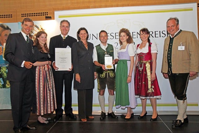 Bundeslandwirtschaftsministerin Ilse Aigner (mitte) überreicht gemeinsam mit DLG-Präsident Carl-Albrecht Bartmer (links) den Bundesehrenpreis in Gold an die Schlossbrauerei Maxlrain: Erich Prinz von Lobkowicz (3. von links), nahm mit Brauereidirektor Roland Bräger (von rechts nach links), Prinzessin Ludmilla von Lobkowicz, Prinzessin Anna von Lobkowicz und Brauereimeister Josef Kronast die Auszeichnung entgegen. - © DLG