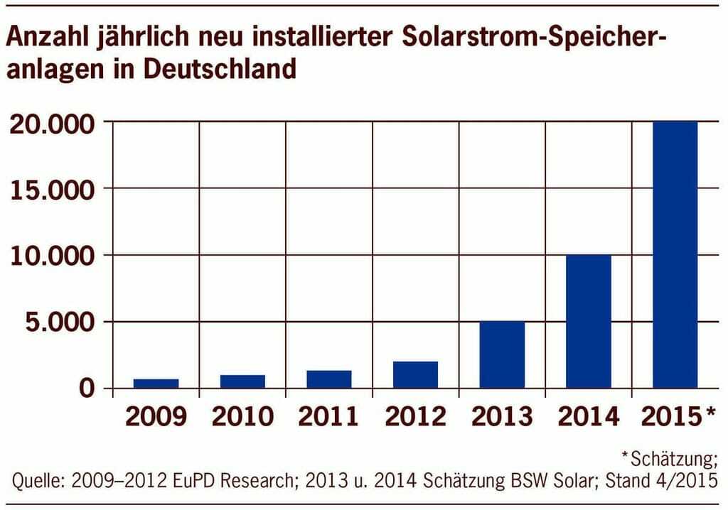 Das ist ohne Energiespeicher nicht möglich. Die Anzahl der installierten Stromspeicher wuchs nach Angaben des Bundesverbandes Solarwirtschaft innerhalb der vergangenen zwölf Monate um das Doppelte auf 20.000 Einheiten. Die erhöhte Nachfrage und die technische Entwicklung haben umgekehrt zu einem deutlichen Preisrutsch geführt. Innerhalb von zwei Jahren sank der Preis um 26 Prozent. Vor allem Lithium-Systeme seien seit Mitte 2014 teilweise um bis zu 50 Prozent im Preis gefallen. Die günstigen Preise und die Förderung durch die KfW haben die Nachfrage weiter befördert. Deutschlandweit werden derzeit 600 Systeme monatlich verkauft, meist in Verbindung mit einer Photovoltaikanlage.