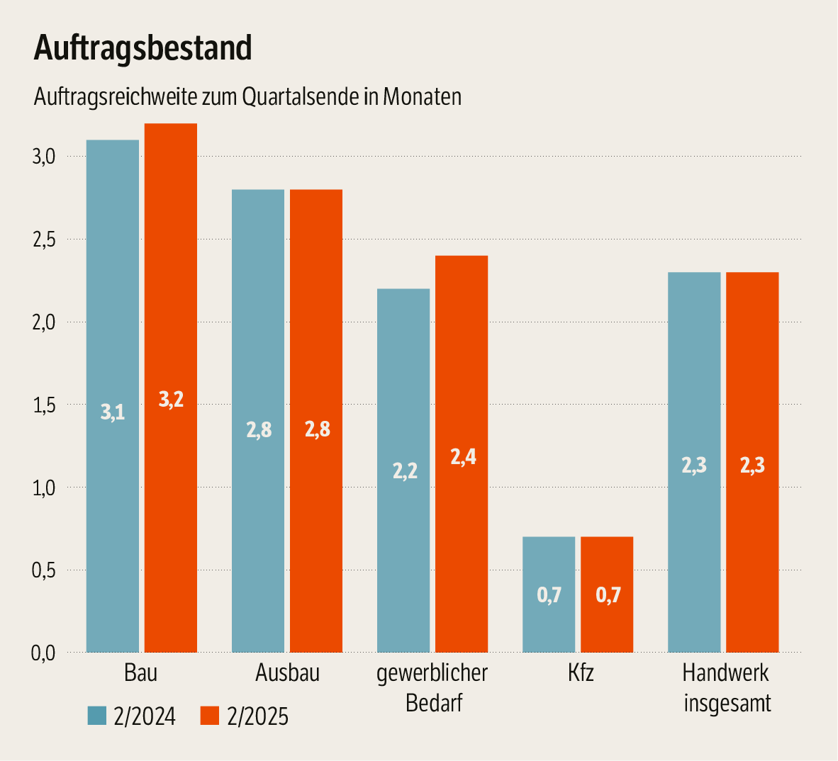 Die Umsatzentwicklung im Frühling verlief in ruhigen Bahnen. Immerhin lag der Saldo aus positiven und negativen Bewertungen nicht mehr unter der Nulllinie. Laut amtlicher Statistik waren die nominalen Umsätze der zulassungspflichtigen Handwerke von Januar bis März 2025 um 0,4 Prozent höher als im Vorjahr.
