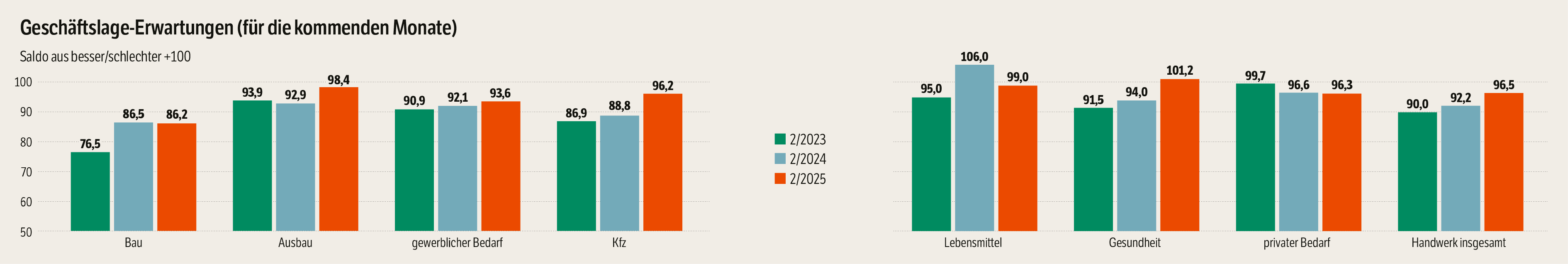 Die Erwartungen der Handwerksunternehmer zur Geschäftsentwicklung deuten nicht auf einen Durchbruch hin. Elf von 100 Betrieben waren Ende Juni optimistisch, 75 Prozent rechneten mit einer Seitwärtsbewegung, 14 Prozent antworteten mit Skepsis. Der aus diesen Daten gewonnene Indexwert von knapp 97 Punkten, der die Erwartungen zusammenfasst, ist etwas höher als die entsprechende Bewertung vor einem Jahr (92).