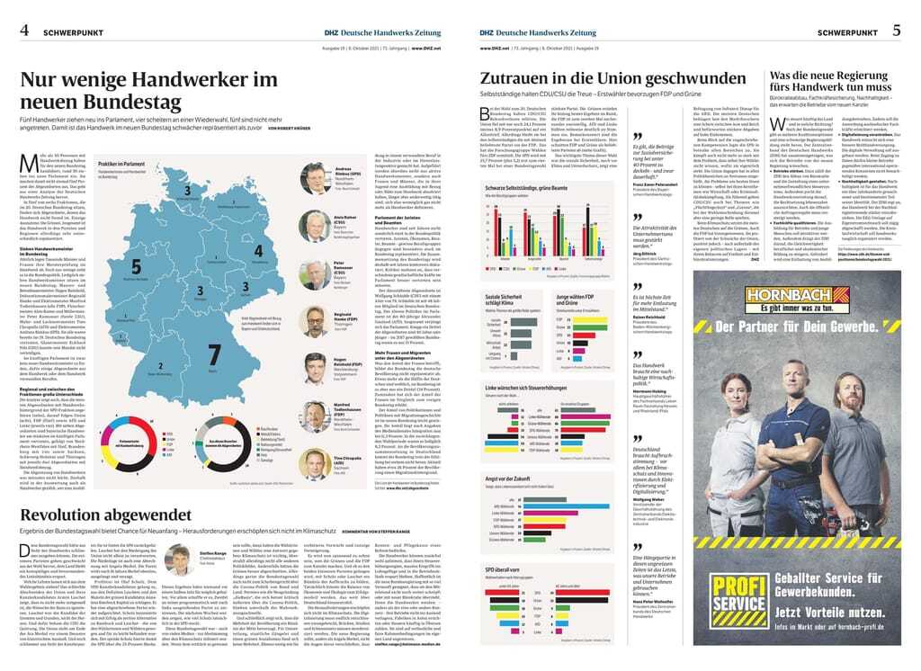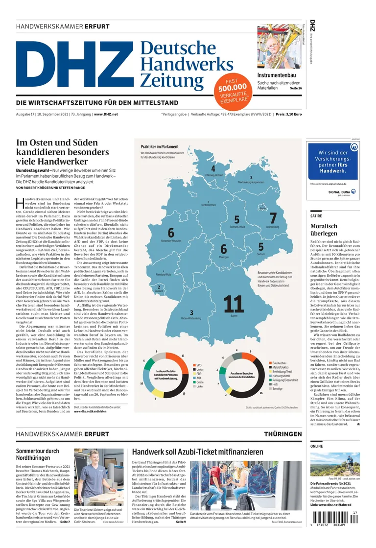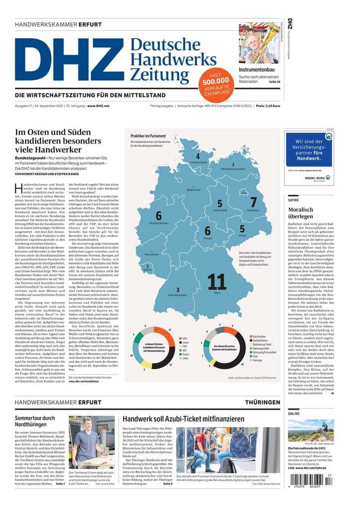Dies deckt sich mit der umfassenden datenjournalistischen Analyse, die am 10. September 2021 auf der Titelseite Deutschlands auflagenstärkster Wirtschaftszeitung für den Mittelstand (fast 500.000 verkaufte Exemplare) veröffentlicht wurde: Nur rund 50 Personen mit Handwerksbezug kandidierten für den neuen Bundestag. Die meisten davon aus den Reihen der Union und SPD sowie aus dem Bereich Metall/Elektro. Die zentralen Ergebnisse visualisierte die DHZ in Form von zwei Kreisdiagrammen auf dem Cover. Auf einer großflächigen Deutschlandkarte stellte die DHZ dar, wie sich die Bewerber regional auf die Bundesrepublik verteilten.