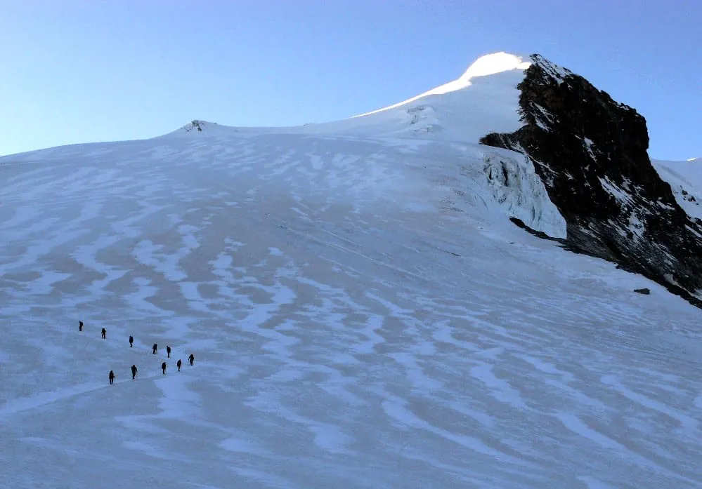 © Ulrich SteudelDas 4.153 Meter hohe Bishorn im schweizerischen Wallis gilt als einer der am einfachsten zu besteigenden 4000er der Westalpen. Ein Spaziergang ist es trotzdem nicht. Denn anders als bei anderen hohen Bergen der Region steht keine Seilbahn als Aufstiegshilfe zur Verfügung. Allein vom Talort Zinal bis zur Tracuit-Hütte sind es knapp 1600 Höhenmeter. -