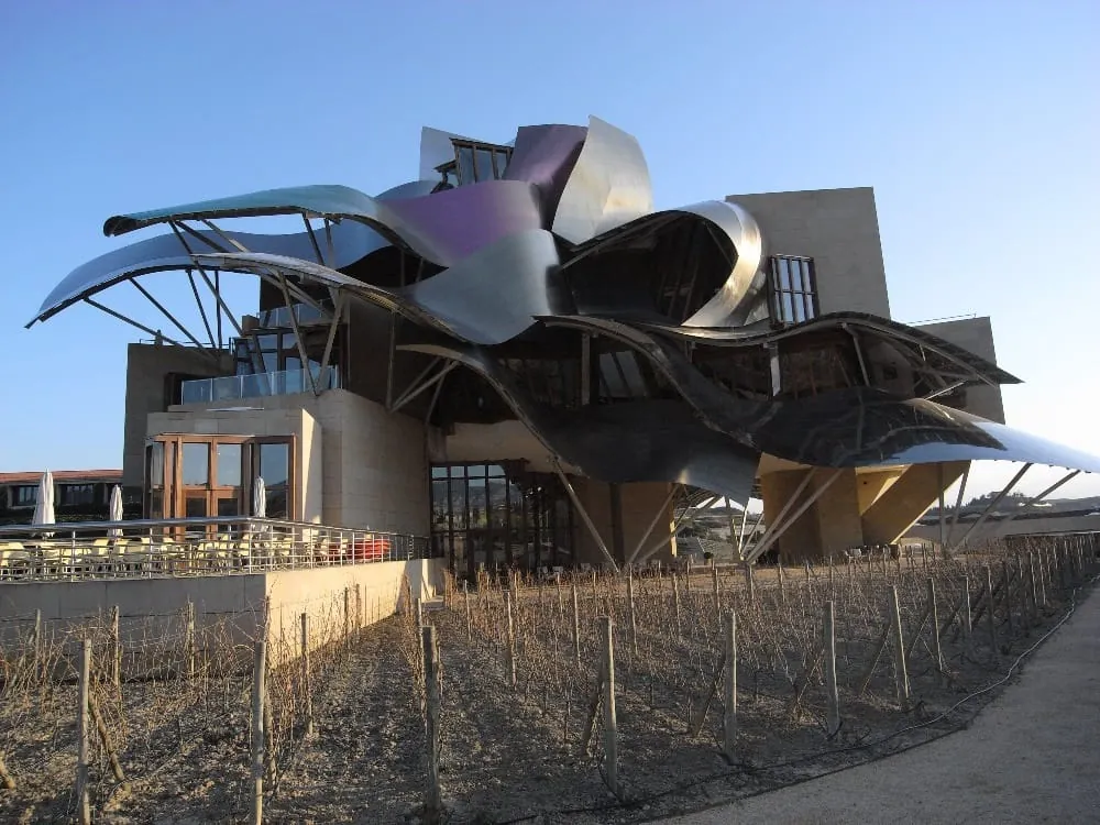 © Ulrich SteudelMitten im Herzen des spanischen Rioja-Gebietes liegt die Stadt des Weines, Elciego. Hier hat der kanadische Stararchitekt Frank O. Gehry für die Winzerdynastie Marqués de Riscal dieses avantgardistische Hotel gebaut. Im Tal des Ebro werden auf rund 60.000 Hektar Rebfläche pro Jahr rund 250 Millionen Liter Wein erzeugt, 85 Prozent davon Rotwein. -