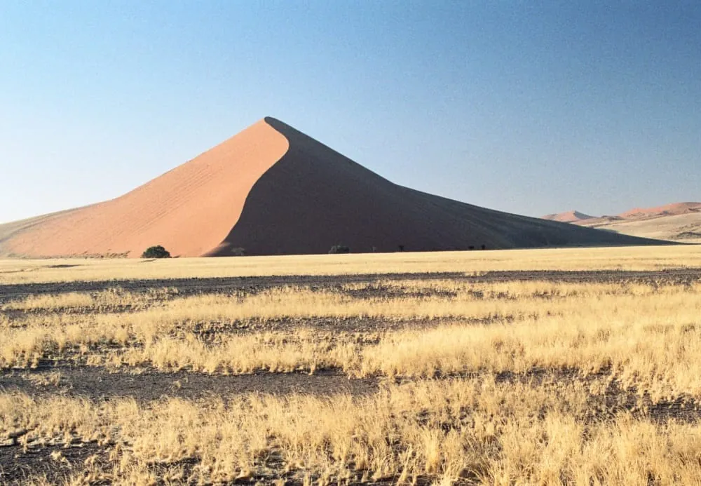 © Ulrich SteudelDie Sanddünen von Sossusvlei in der Namib-Wüste erreichen eine Höhe von bis zu 300 Metern und gehören damit zu den höchsten der Welt. Wer sie besuchen möchte, sollte früh dran sein, denn wenn sich die Sonne im Namib-Naukluft-Park dem Zenit nähert, wird die Sandoberfläche heiß wie eine Bratpfanne. -