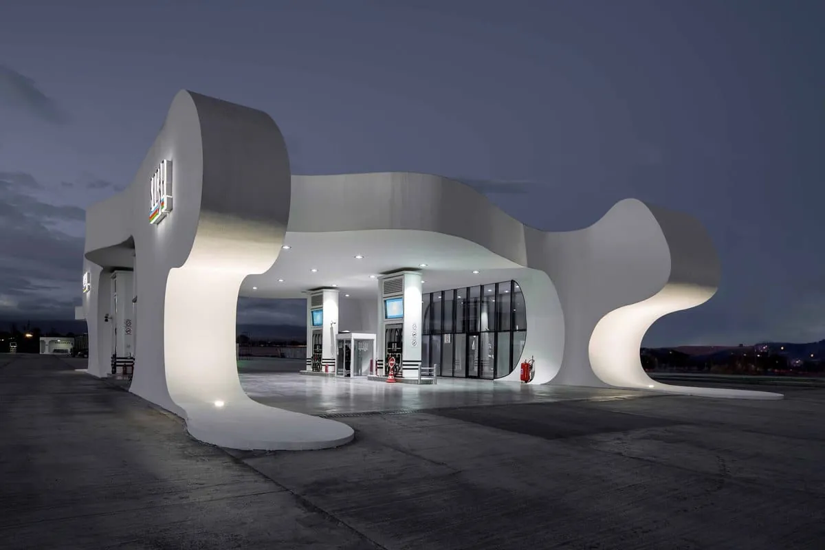 Diese Tankstelle hat nicht nur eine außergewöhnliche Form. Sie war auch die erste Tankstelle Spaniens, die Biodiesel und Bioethanol verkaufte. Die Tankstelle mit dem auffälligen Fotovoltaik-Holzdach wurde 2007 gebaut.