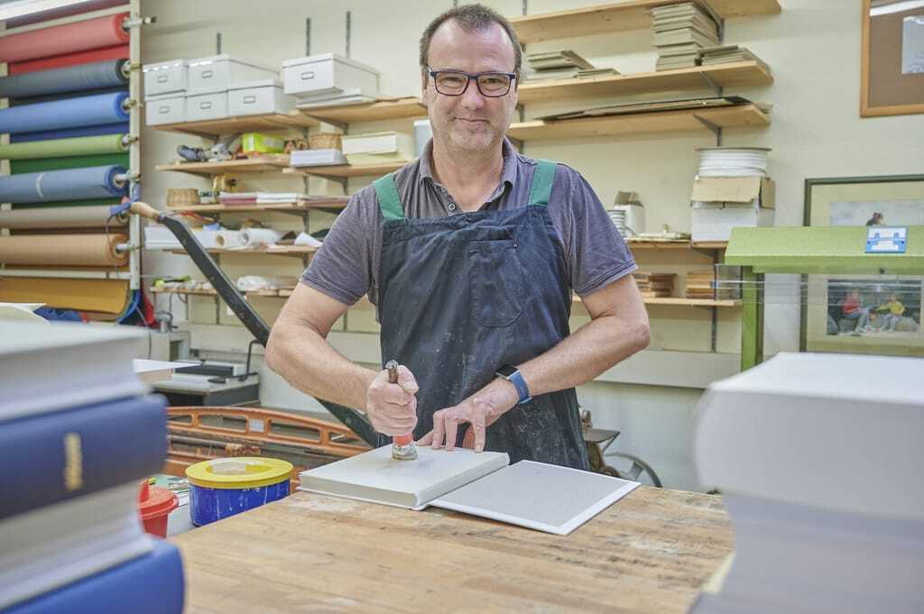 Von einem Bild an der Wand überschaut ein Mann das Geschehen in der Werkstatt. "Das ist mein Vater Joachim Hesse", erklärt Matthias Hesse. Von ihm hat er die Buchbinderei im Jahr 1998 übernommen. Doch die Geschichte des Betriebes geht viel weiter zurück als bis zu seinem Vater.