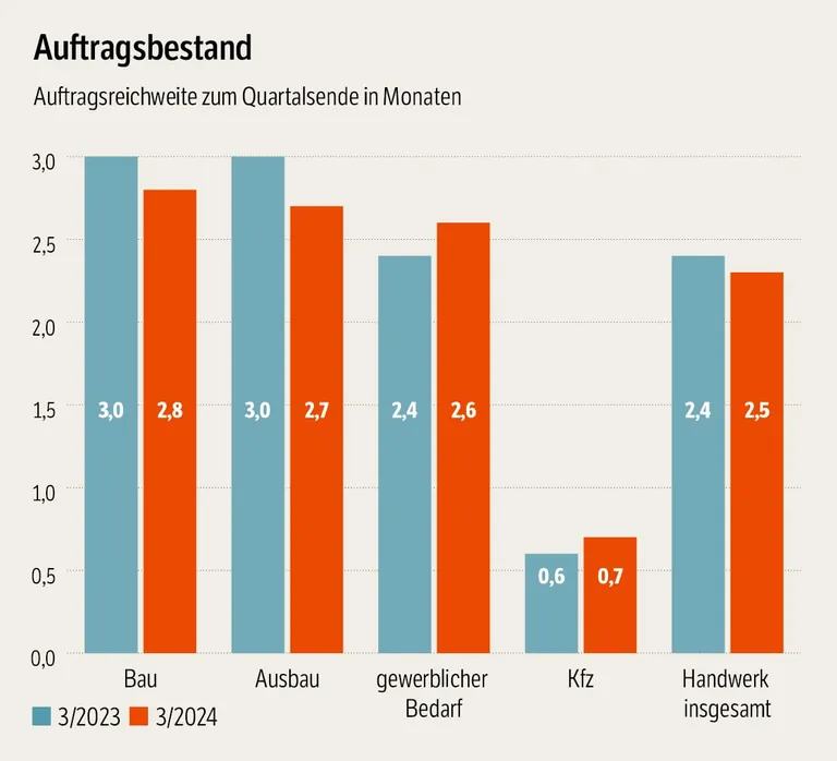 Die Handwerke für gewerblichen Bedarf, zu denen Zulieferer der Industrie ebenso zählen wie Reinigungsfirmen, Informationstechniker oder Metallbauer, konnten zuletzt wieder zufriedener auf ihre Lage blicken. Gegenüber dem Vorjahr stagnierte zwar die Auslastung, gleichzeitig legten die Auftragsbestände aber zu. Der Trend überrascht ein wenig, denn die deutsche Industrie als wichtiger Auftraggeber gilt derzeit als Konjunkturbremse.