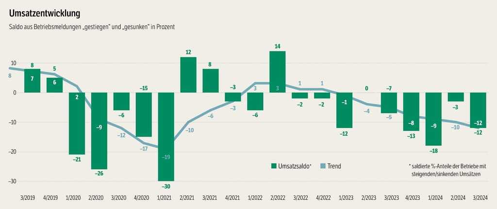 Auch die Umsatzentwicklung weist die fehlende Dynamik nach. 29 von 100 Teilnehmern berichteten von schwindenden Einnahmen in den Sommermonaten. Das ist saisonuntypisch und eine vergleichsweise hohe Quote. Der langjährige Mittelwert für diesen Zeitraum liegt bei 20 Prozent. Im 1. Halbjahr 2024 waren die nominalen Umsätze im deutschen Handwerk um 1,4 Prozent gegenüber dem Vorjahr geschrumpft.