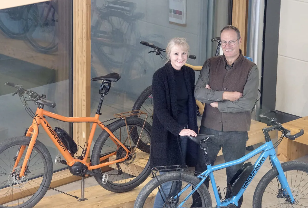 Das Geschäftsführer-Duo und Ehepaar Patricia Rose und Stefan Stiener mit dem neusten Produkt, dem "E-Finder", einem Mittelmotor-Pedelec.