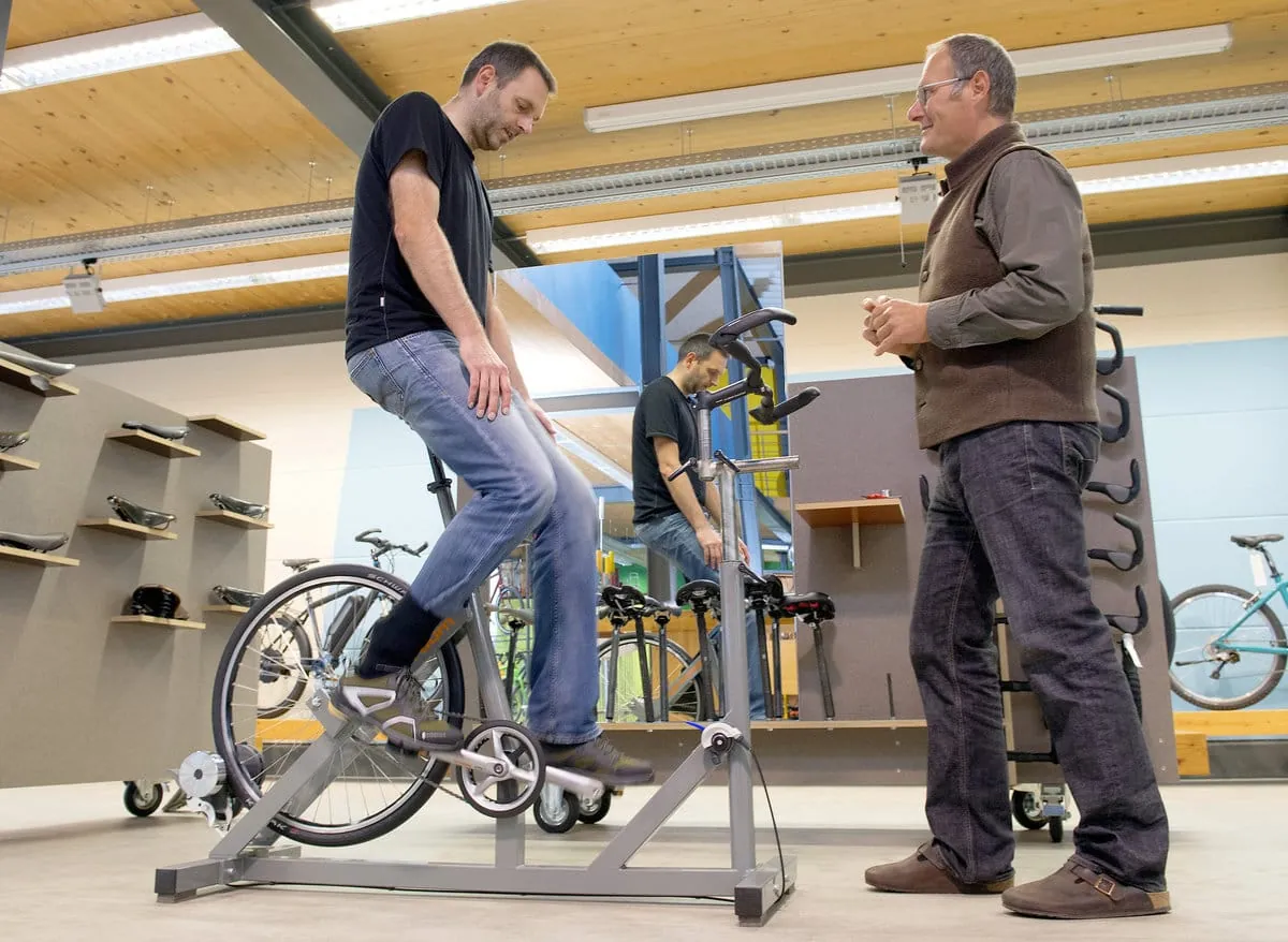 Velotraum-Gründer Stefan Stiener (re.) bei der Fahrradanpassung mit Hilfe der selbst entwickelten Messmaschine.
