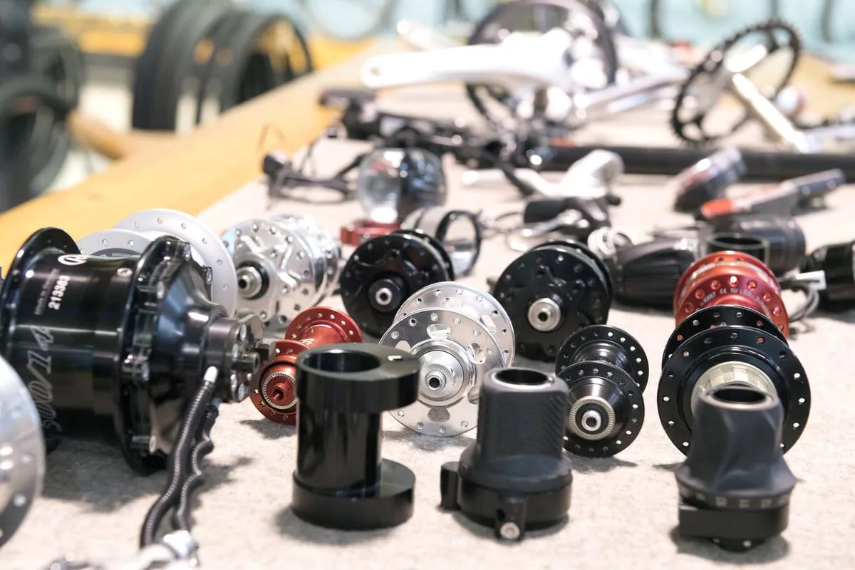 Sehen, fühlen, verstehen: Beratungstresen mit einer Auswahl an Fahrrad­teilen.