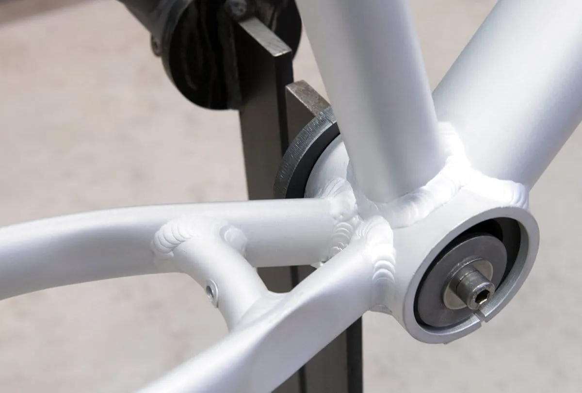Ein unbeschichteter Ausstellungsrahmen zeigt die Verar­beitung und macht Details sichtbar, wie der 2003 von Velotraum eingeführte Exzenter, der inzwischen branchenweiter Standard für Fahrräder mit Nabenschaltungen ist.