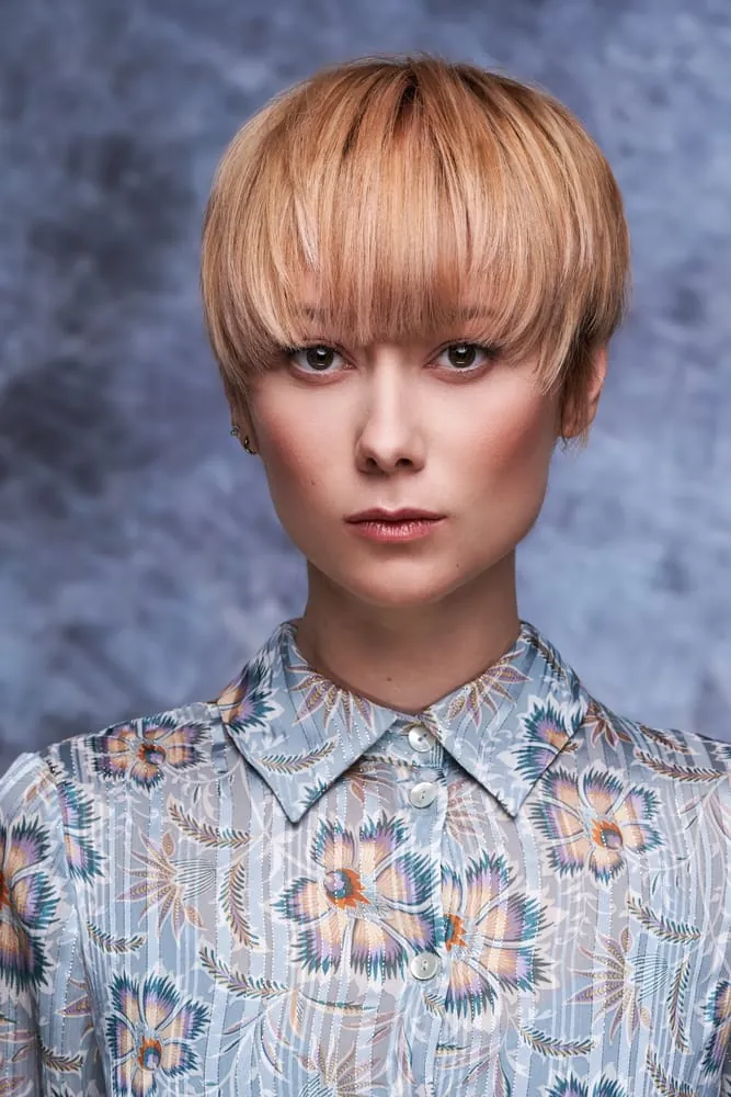 Der Bowl Cut kann rockig, elegant oder romantisch frisiert werden. Der Pony verleiht dem Schnitt eine Vielseitigkeit und lässt viel Spielraum für das Styling. Mit Textur und gelocktem Oberkopf als Swoosh gestylt, eignet sich dieser Bowl Cut als Partyfrisur.