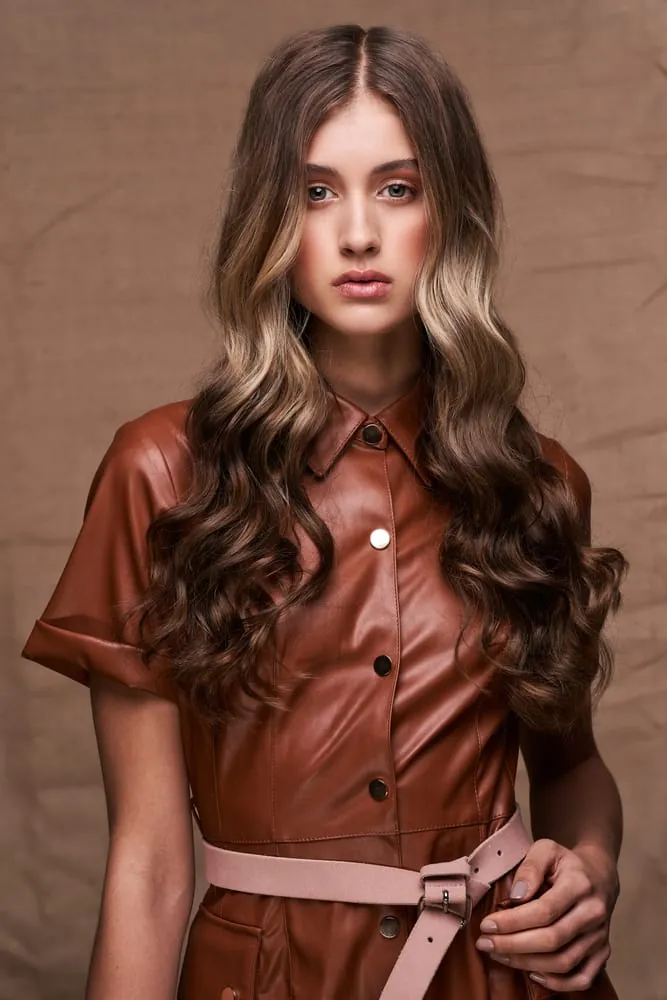 Hier bekommt das dunkelblonde, lange Haar mit einem Spotlight im Mittelteil eine erdschichtähnliche Farbe. Dazu werden die Längen wellig im Retro-Style frisiert.