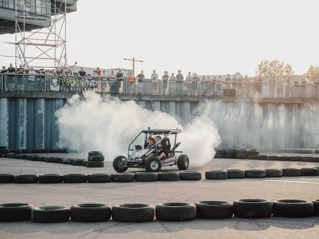 Rund 200 Schrauber haben bereits vor der Veranstaltung eigene Fahrzeuge gebaut und sie mitgebracht. Und sie ließen dabei nichts unversucht: Mit ausreichend Kreativität wird sogar der Einkaufswagen, die Bierkiste oder die Bierzeltgarnitur zum fahrbaren Untersatz. Wenn dann noch der passende Motor angeschraubt und der TÜV, der direkt vor Ort gemacht wird, bestanden ist, sind die selbst gebastelten Fahrzeuge bereit, am Festivalsonntag in der "Arena" im Zentrum des Festivalgeländes gegeneinander anzutreten.