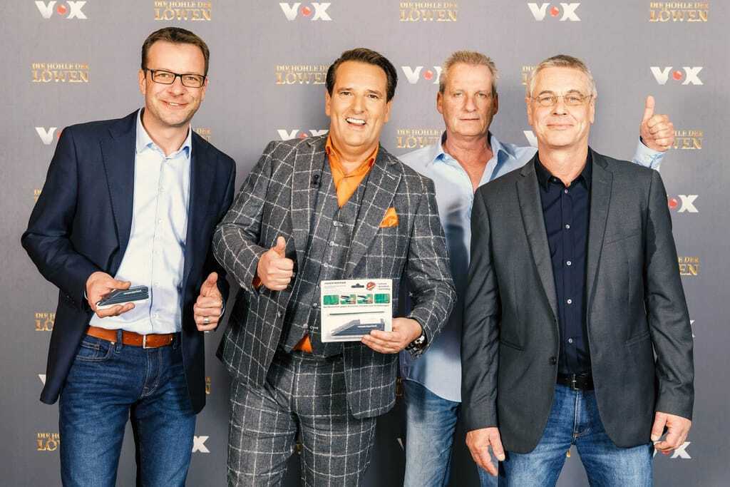 V.l.: Frank Eckert, Bernd Müller und Matthias Herrnbröck aus München haben einen Deal mit Ralf Dümmel (2.v.l.). Er investiert 100.000 Euro für 20 Prozent der Anteile an "Fugentorpedo".