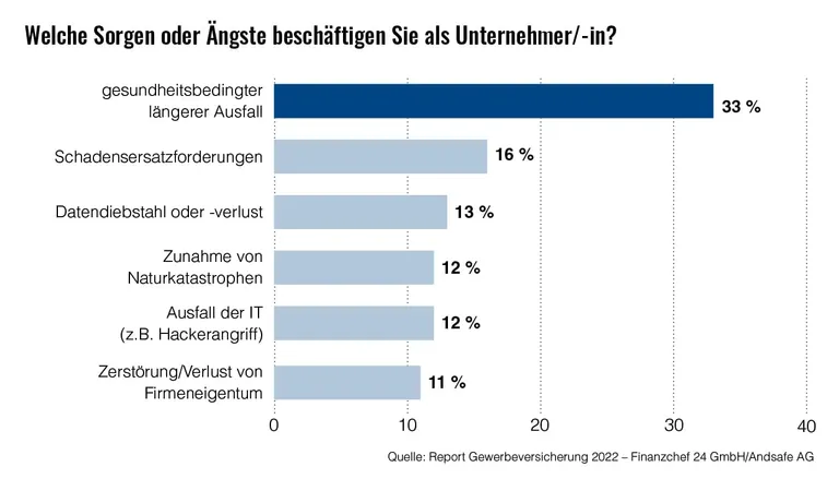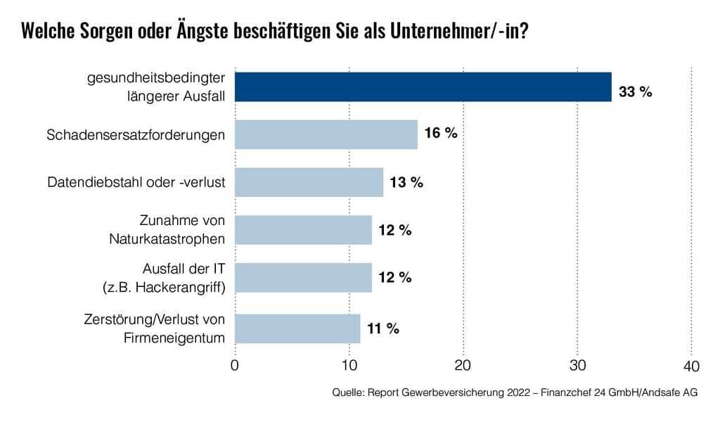 Für viele Unternehmerinnen und Unternehmer des deutschen Klein- und Mittelstandes spielt die eigene Gesundheit vor allem nach dem Durchleben der Corona-Pandemie eine elementare Rolle. Gesundheitsbedingt länger auszufallen ist für etwa ein Drittel der befragten Personen (33 Prozent) die mit Abstand größte Sorge. Das zeigt der Gewerbeversicherungs-Report 2022 von Finanzchef 24 GmbH und Andsafe AG. Ihre Angst vor einem gesundheitlichen Ausfall halten jedoch nur 13 Prozent der Umfrageteilnehmenden für sehr gut abgesichert. Die Hälfte der Unternehmerinnen und Unternehmer wünscht sich dementsprechend eine starke Absicherung von gesundheitlichen Risiken sowie krankheitsbedingten Ausfällen.