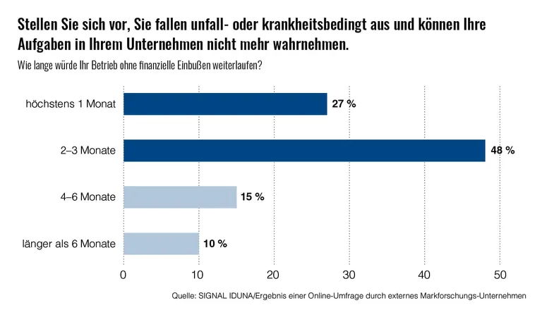 Gerade in kleineren und mittleren Handwerksbetrieben sind die Inhaberinnen und Inhaber sowie Geschäftsführende der Dreh- und Angelpunkt des Unternehmens. Ihr Ausfall kann nicht nur den gesamten Betriebsablauf gefährden, sondern schnell zu einem existenzbedrohenden, finanziellen Risiko werden. Das zeigt auch das Ergebnis einer Online-Umfrage durch ein externes Marktforschungs-Unternehmen im Auftrag von SIGNAL IDUNA: Bei einem plötzlichen Ausfall kann der Betrieb bei einem Großteil der Befragten (75 Prozent) maximal drei Monate ohne finanzielle Einbußen weiterlaufen. Kleinbetriebe mit bis zu fünf Personen sind laut den Umfrageergebnissen besonders betroffen.