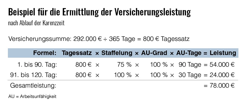Sie erhalten für jeden Tag eines unfall- oder krankheitsbedingten Ausfalls nach Ablauf der Karenzzeit einen Tagessatz. Dieser wird in Abhängigkeit von der Versicherungssumme, der Dauer und des Grades der Arbeitsunfähigkeit berechnet. Um den pauschalen Tagessatz, also die konkrete Versicherungsleistung pro Tag, zu errechnen, wird die vorher festgelegte Versicherungssumme auf 365 Tage aufgeteilt. Da der Finanzbedarf mit der Dauer des Ausfalls steigt, ist der Tagessatz gestaffelt:
