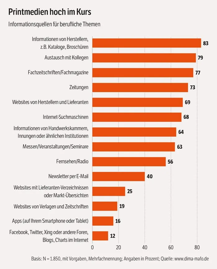Bedrucktes Papier spielt im Handwerk nach wie vor eine große Rolle. Besonders gern informieren sich Handwerker mit Hilfe von Katalogen und Broschüren, aber auch der Austausch mit Kollegen ist ihnen wichtig. Auch Fachzeitschriften und Zeitungen spielen eine wichtige Rolle bei der Informationsbeschaffung. Digitale Medien werden unterm Strich weniger genutzt als gedruckte Informationen, allerdings ist das auch eine Altersfrage. Für jüngere Handwerker sind digitale Medien aus dem Arbeitsalltag nicht mehr wegzudenken.