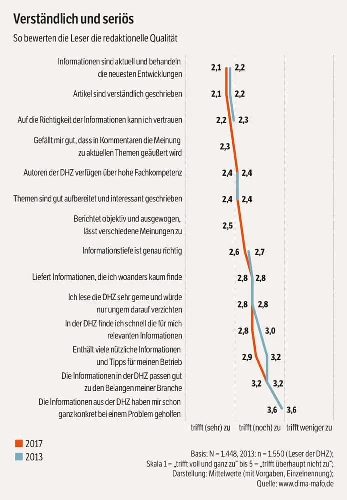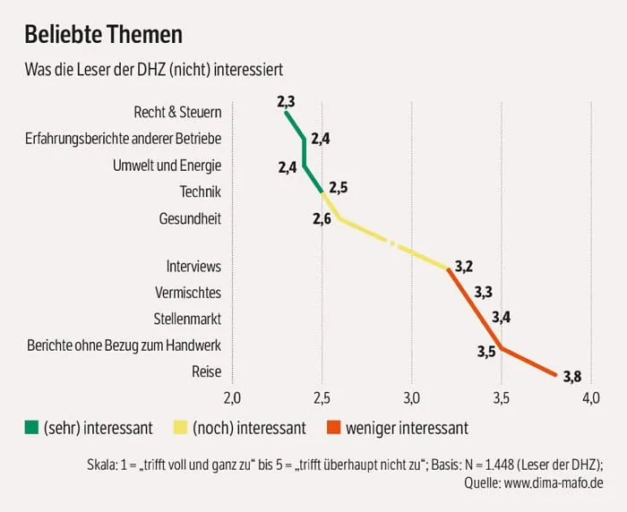 Seit Jahren landen in allen Erhebungen harte Nutzwertthemen auf den vorderen Plätzen. Damit sind Rubriken wie Steuern, Recht, Betriebswirtschaft und Technik gemeint – Informationen also, die die Handwerker direkt in ihrem Betrieb anwenden können. Weniger gefragt sind Themen, die keinen unmittelbaren Bezug zum Handwerk haben, etwa Reise. Beliebt sind auch Handwerkerporträts und Praxisbeispiele aus anderen Betrieben. Die Leserinnen und Leser erwarten, dass Digitalisierung, Automatisierung sowie Umweltthemen an Bedeutung zunehmen – was sich in der künftigen Ausrichtung der DHZ niederschlägt.