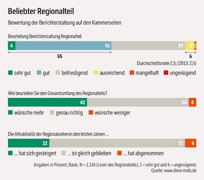Handwerker sind regional verwurzelt. Das zeigt sich auch an der Bedeutung der Regionalberichterstattung für die Deutsche Handwerks Zeitung. Rund ein Drittel der Lesezeit entfällt auf den Regionalteil. Mehr als die Hälfte beurteilt die Regionalberichterstattung der Kammern als gut oder sehr gut. 42 Prozent der Leserinnen und Leser würden sich sogar mehr Berichte aus ihrem Kammerbezirk wünschen.