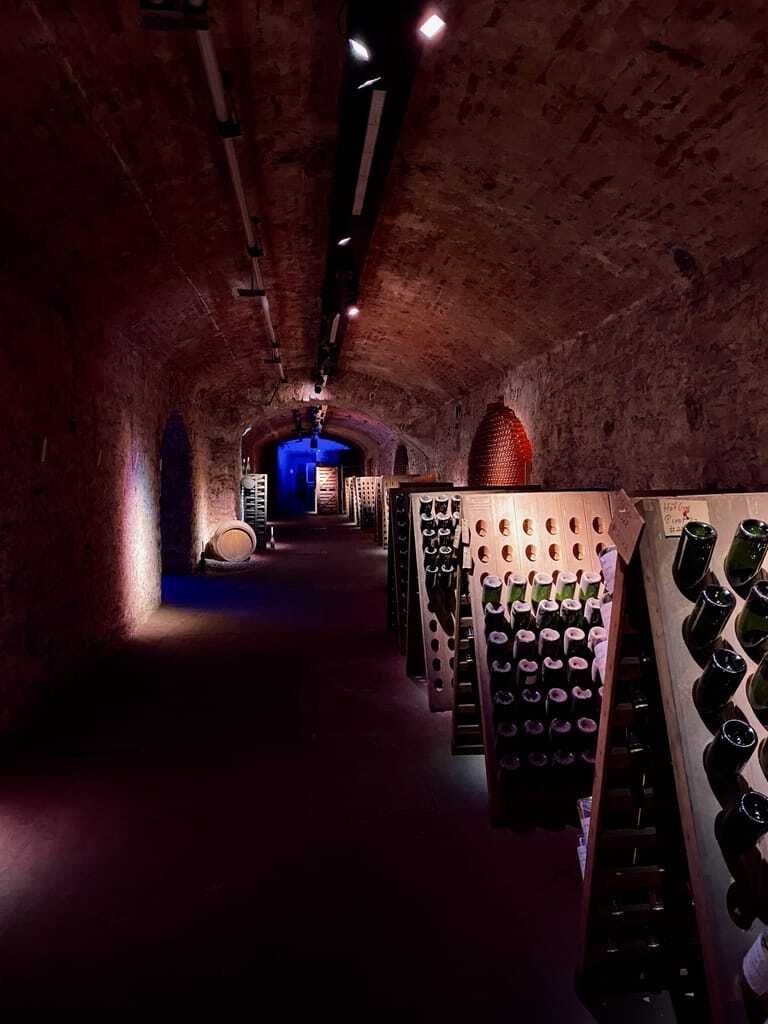 Kerzen flackern an den Wänden und werfen lange Schatten auf das alte Mauerwerk. Flaschenreihen ruhen in hölzernen Rüttelpulten. Feiner Staub hat sich wie ein Schleier auf die Flaschen gelegt, als ob die Zeit hier stillsteht. "Hier unten ruht unser Sekt mindestens neun Monate. Meistens jedoch sogar mehrere Jahre", sagt Diemer und streicht mit der Hand leicht über eine der Flaschen: "Der langsame Reifeprozess sorgt für die feine Perlage und den komplexen Geschmack." Sie nimmt eine Flasche in die Hand und hält sie gegen das Kerzenlicht. "Die Ablagerung am Boden ist die Hefe aus der zweiten Gärung."