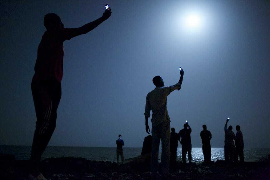Afrikanische Migranten am Strand von Dschibuti halten nachts ihre Handys in die Luft, um ein preisgünstiges Signal aus dem Nachbarland Somalia aufzufangen – eine schwache Verbindung zu fernen Verwandten. Dschibuti ist eine viel genutzte Durchgangsstation für Flüchtlinge aus Ländern wie Somalia, Eritrea und Äthiopien, auf der Suche nach einem besseren Leben in Europa und dem Mittleren Osten.