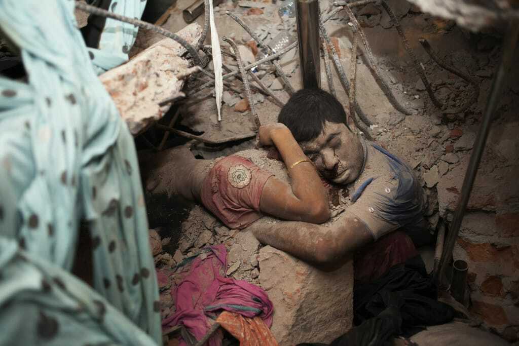 Am Tag nach dem Einsturz des Rana Plaza, in Sabhar, Bangladesch, in dem fünf Textilfabriken untergebracht waren, liegen noch Opfer in den Trümmern. In welchem Verhältnis diese beiden Menschen zueinander standen ist nicht bekannt.