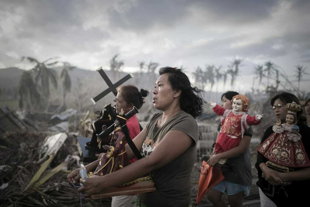Zehn Tage nachdem der Taifun Haiyan Land erreichte, tragen Überlebende in Tolosa, auf Leyte, einer Insel der Zentralphilippinen, in einer Prozession religiöse Statuen. Haiyan, einer der stärksten Taifune, die je gemeldet worden sind, raste über 47 Provinzen und verursachte enorme Verwüstungen. Über eine Million Häuser wurden beschädigt, die Hälfte davon total zerstört und über vier Millionen Menschen flüchteten. Große Gebiete verfügten wochenlang weder über Strom noch über ausreichend Wasser und die zerstörte Infrastruktur erschwerte die Verteilung von Nahrungsmitteln und ärztliche Versorgung. Viele Leute zogen in weniger betroffene Gebiete, wie die Hauptstadt Manila und manche Städte meldeten, dass sich die Zahl ihrer Einwohner fast verdoppelte.